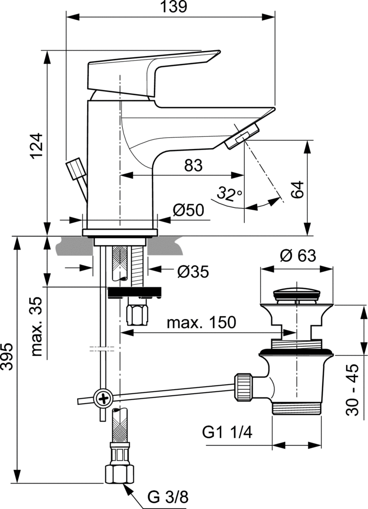 Tesi bateria umywalkowa Piccolo jednootworowa z metalowym automatycznym korkiem. Głowica ceramiczna IS 28 mm z ogranicznikiem temperatury. Mosiężny, odlewany korpus. Metalowy uchwyt z nadrukowanymi czerwonymi i niebieskimi oznaczeniami. Perlator typu Cascade z ogranicznikiem przepływu wody do 5 l/min. Wężyki przyłączeniowe G3/8".