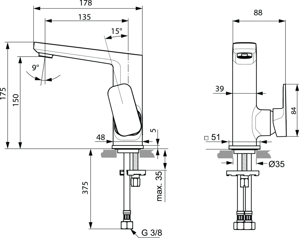 Bateria umywalkowa wysoka z głowicą ceramiczną 28 mm i ogranicznikiem temperatury. Mosiężny, odlewany korpus. Metalowy uchwyt z nadrukowanymi czerwonymi i niebieskimi oznaczeniami bez metalowego automatycznego korka. Perlator typu Cascade z ogranicznikiem przepływu wody do 5 l/min i regulacją kierunku strumienia. Elastyczne węże przyłączeniowe z gwintem G3/8". System montażu EASY-FIX. Metalowy pierścień.