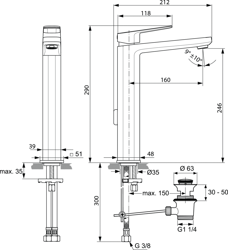 Jednootworowa wysoka bateria umywalkowa z głowicą ceramiczną 28 mm i ogranicznikiem temperatury. Mosiężny, odlewany korpus. Metalowy uchwyt z nadrukowanymi czerwonymi i niebieskimi oznaczeniami oraz metalowy automatyczny korek. Perlator typu Cascade z ogranicznikiem przepływu wody do 5 l/min i regulacją kierunku strumienia. Elastyczne węże przyłączeniowe z gwintem G3/8". System montażu EASY-FIX. Metalowy pierścień.