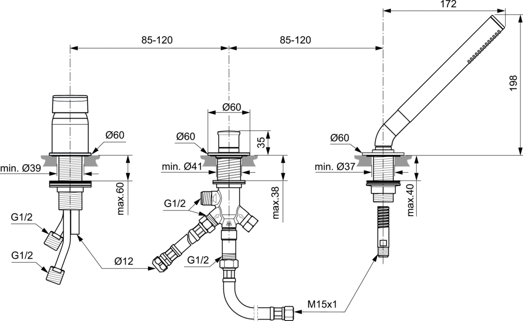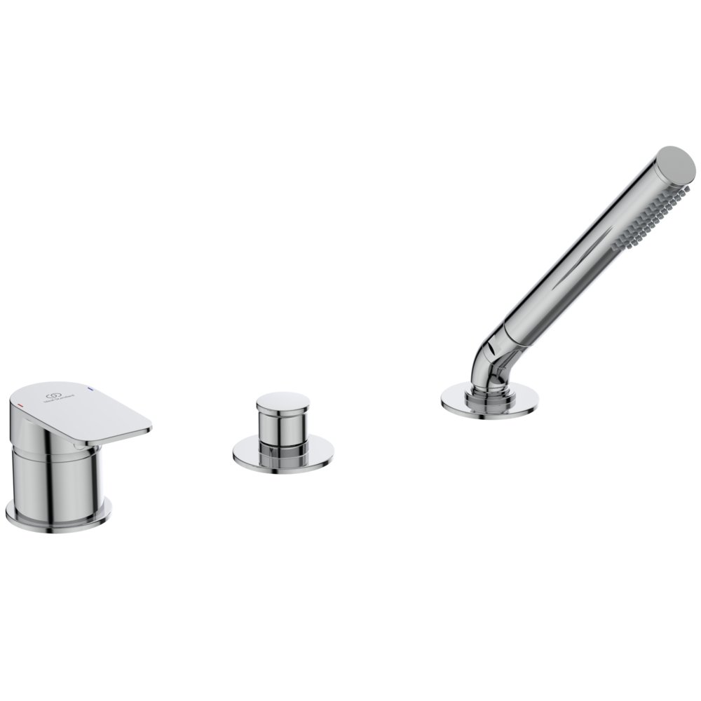 Bateria wannowo-natryskowa 3-otworowa Multiplex Trio. Zintegrowana głowica Multiport 40 mm z ogranicznikiem temperatury. Automatyczny przełącznik i zawór zwrotny. Do stosowania wyłącznie z systemem Multiplex Trio. Niezbędne wyposażenie: urządzenie odpływowo-przelewowe Multiplex Trio dla wanien o głębokości powyżej 45 cm - K7812AA lub K7808AA dla wanien o ogłębokości 45 cm i mniejszej.