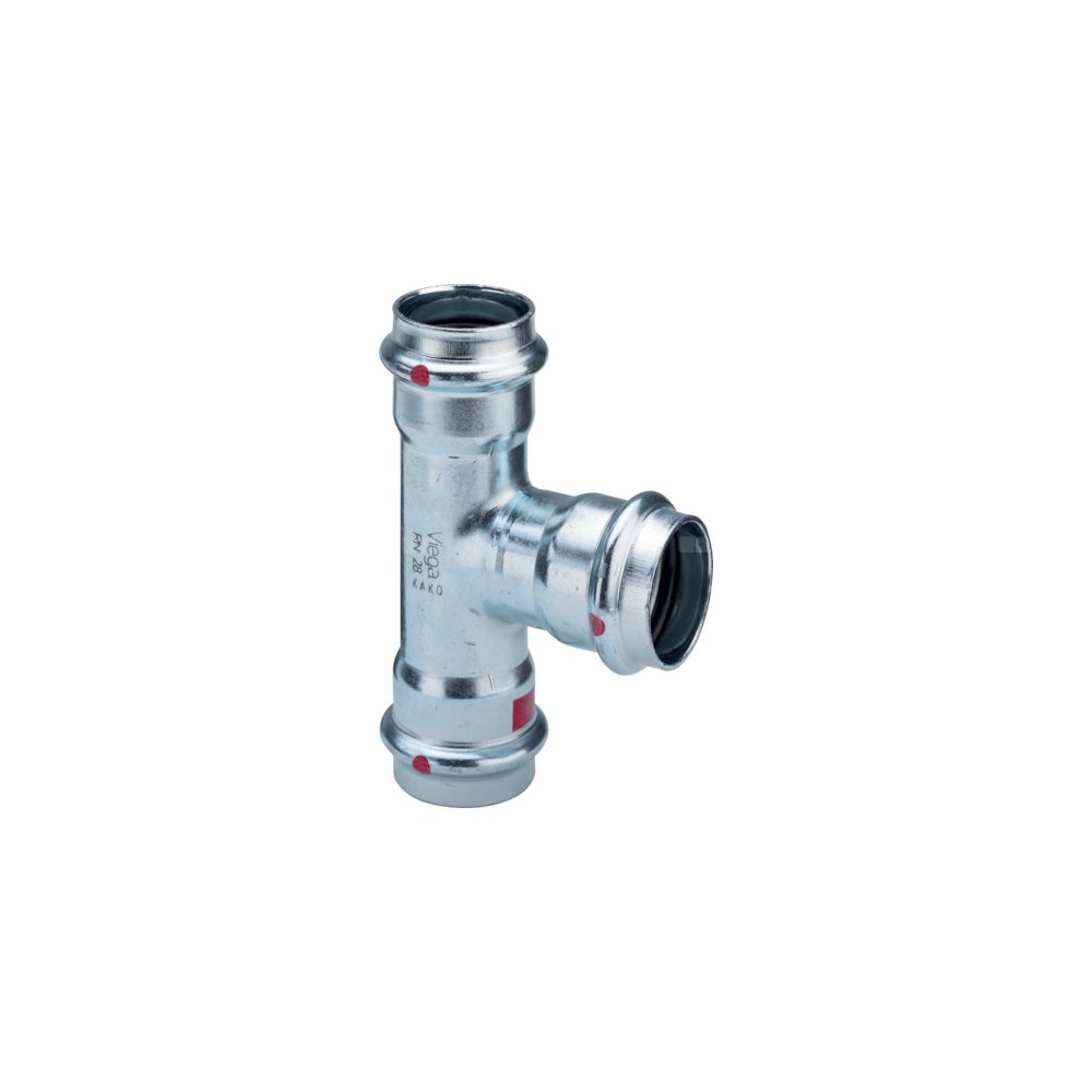Prestabo-trójnik, z SC-Contur, stal niestopowa, ocynkowana, przyłącza zaprasowywane. Wyposażenie: Elementy uszczelniające EPDM, nr wzoru 1118, nr kat. 642 556, d1: 42 d2: 15 d3: 42