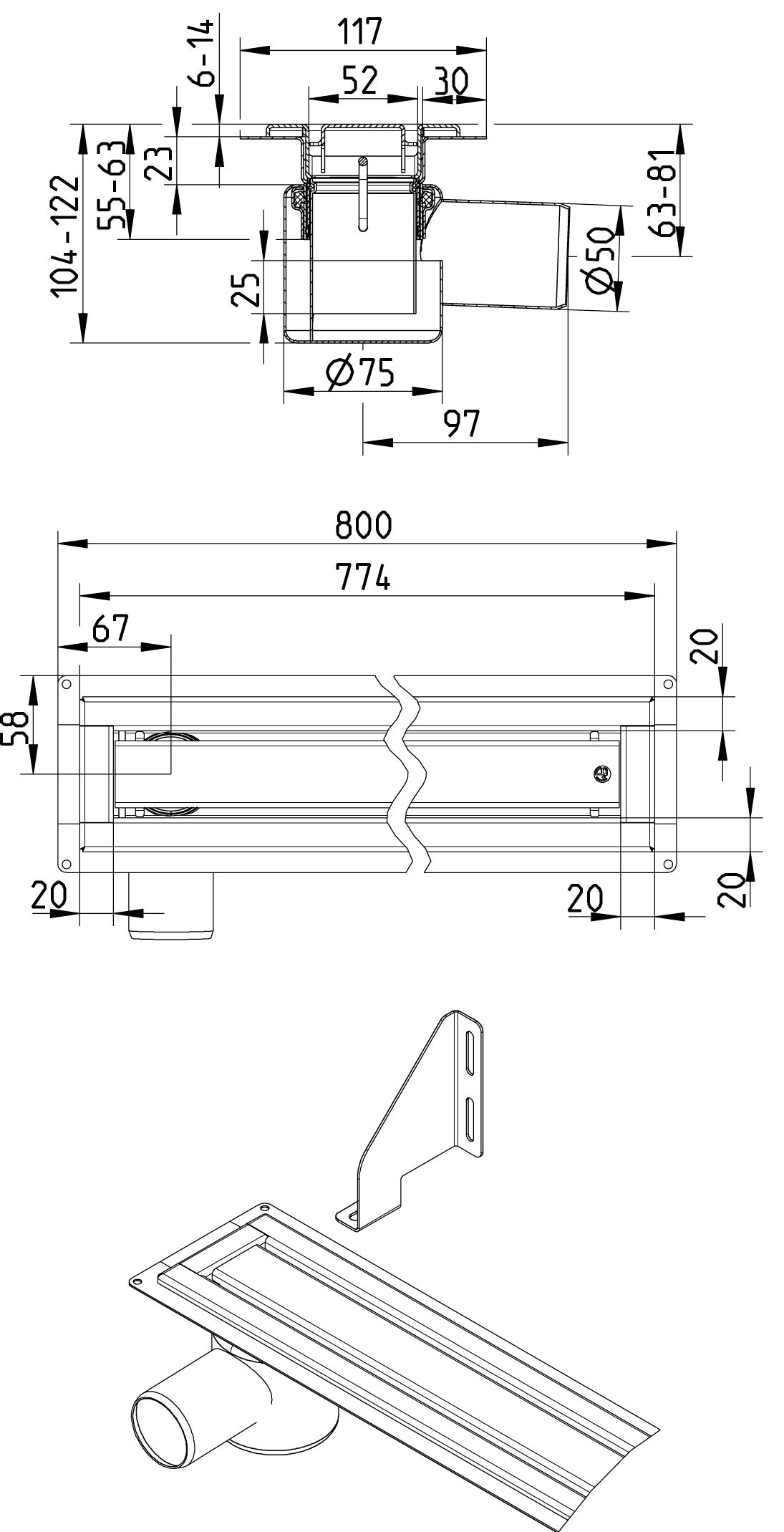WaterLine Kanał prysznicowy 800, zestaw z syfonem i rusztem
