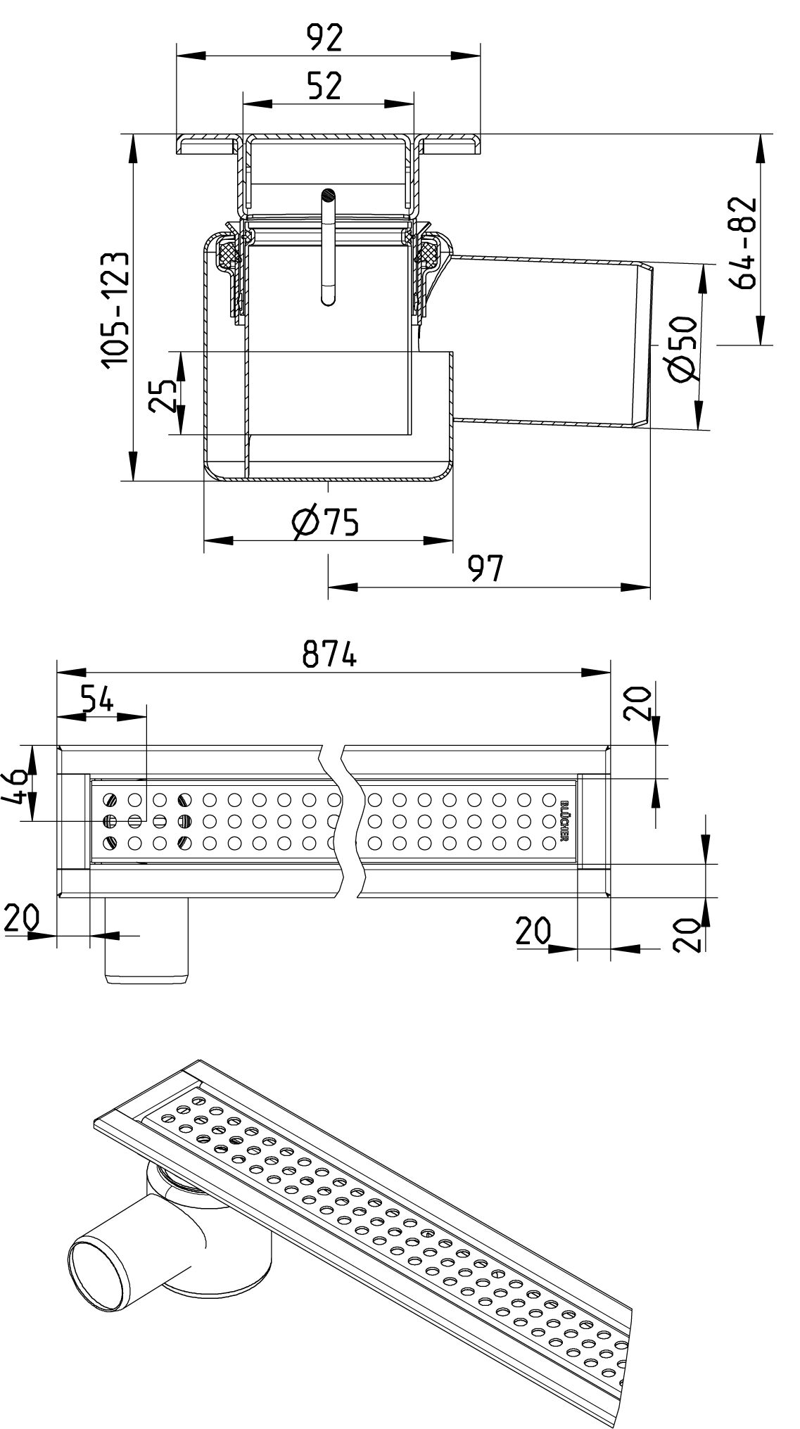 WaterLine Kanał prysznicowy 900, zestaw z syfonem i rusztem