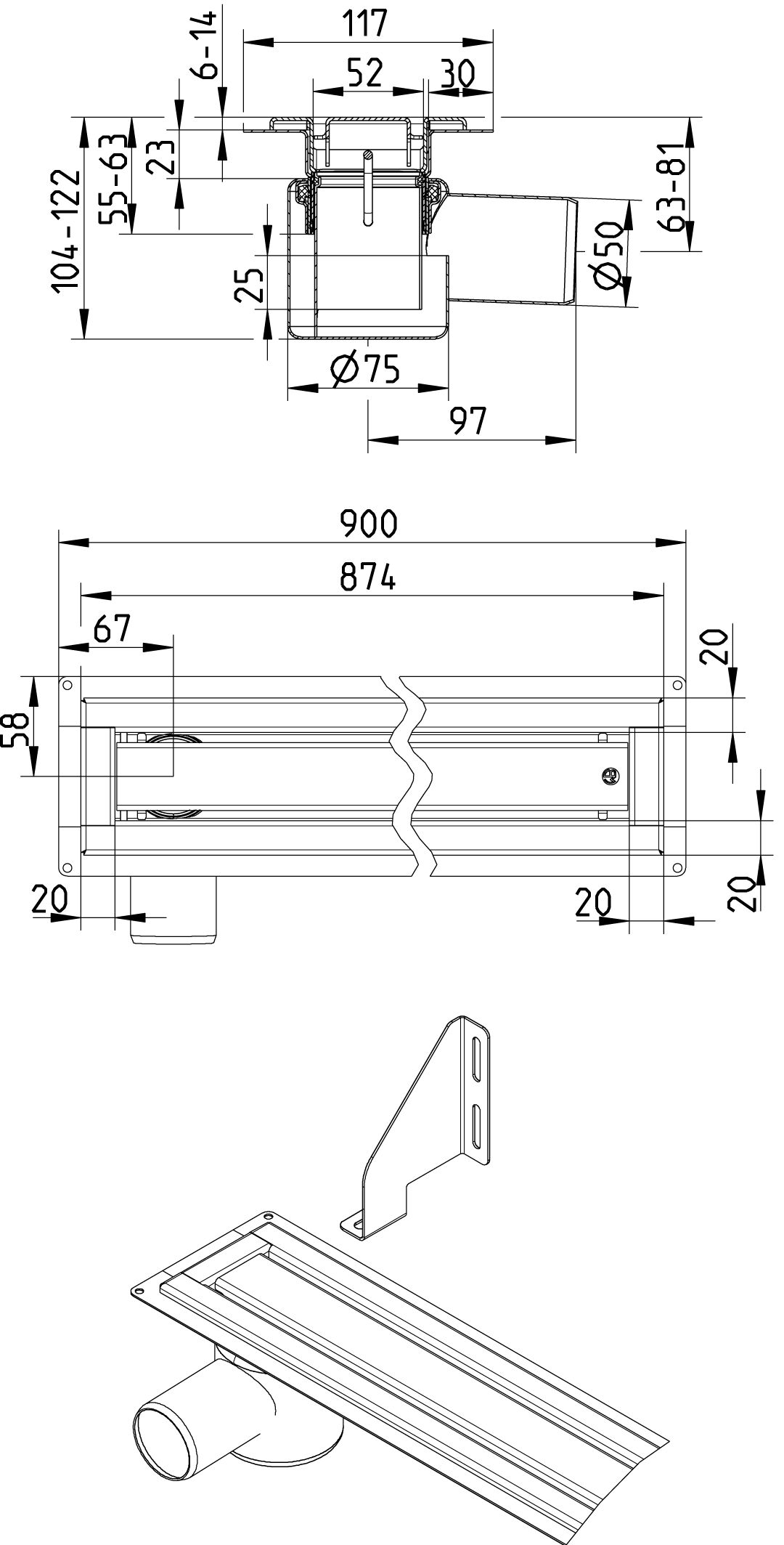 WaterLine Kanał prysznicowy 900, zestaw z syfonem i rusztem