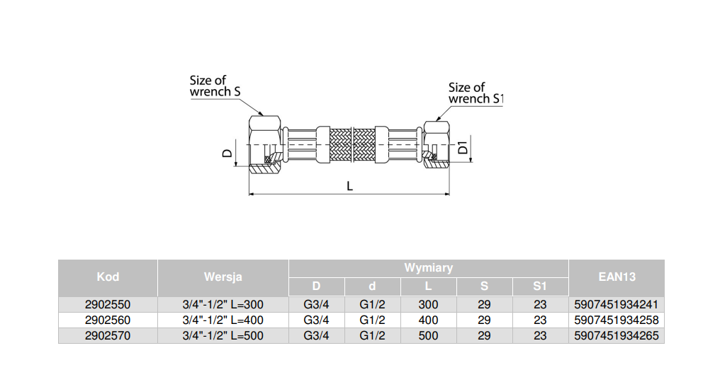 Wąż przyłączeniowy elastyczny VALVEX Viper Plus z oplotem (stal nierdzewna), GW x GW, 3/4'' x 1/2'', długość 300 mm