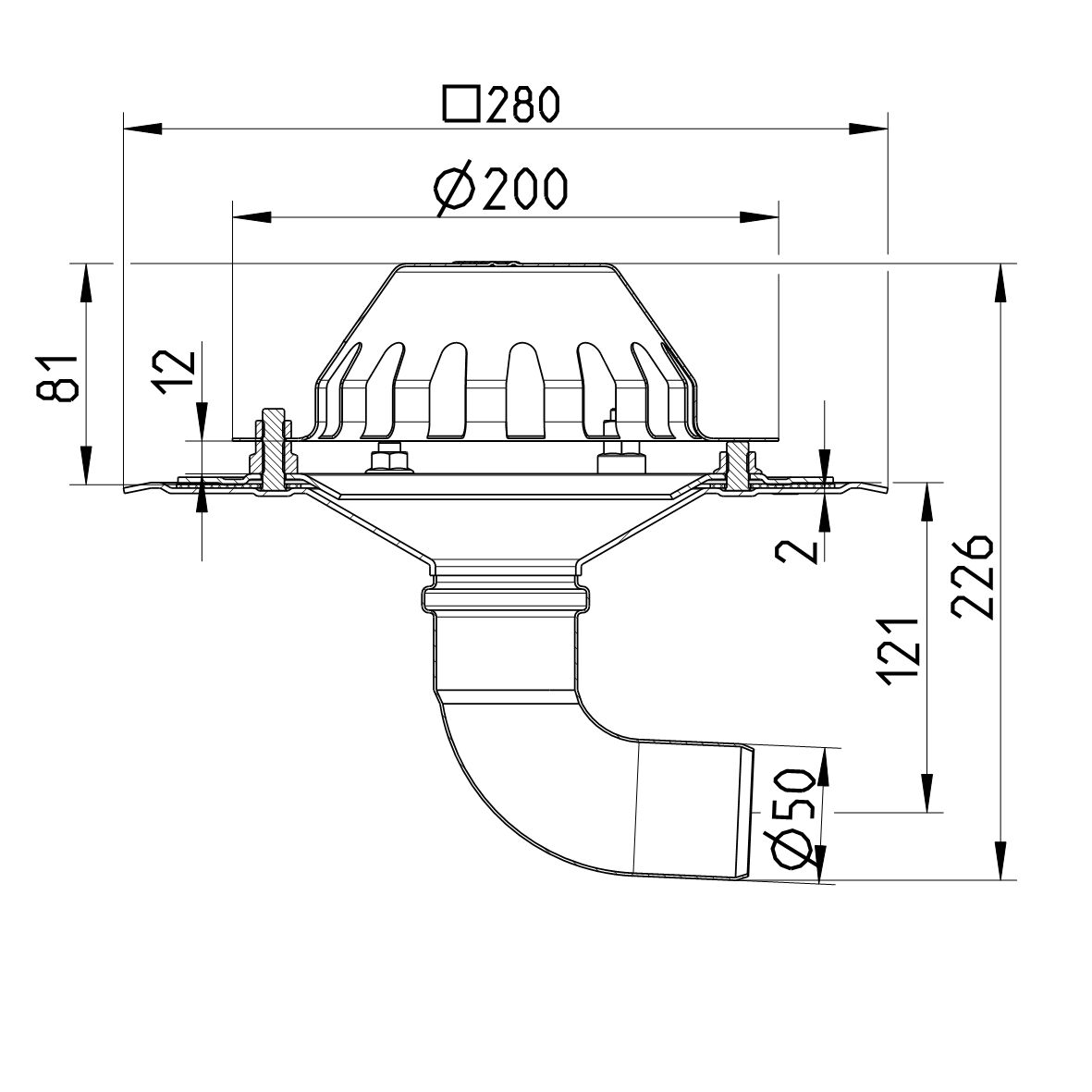 Wpust dachowy grawitacyjny DN =50 mm z kołnierzem nierdzewnym do pojedynczej warstwy izolacyjnej, odpływ poziomy