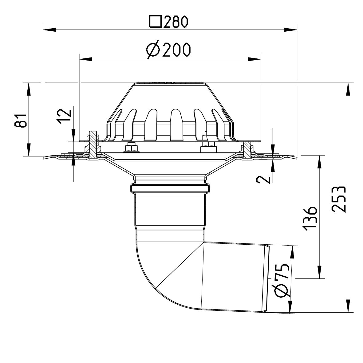 Wpust dachowy grawitacyjny DN =75 mm z kołnierzem nierdzewnym do pojedynczej warstwy izolacyjnej, odpływ poziomy