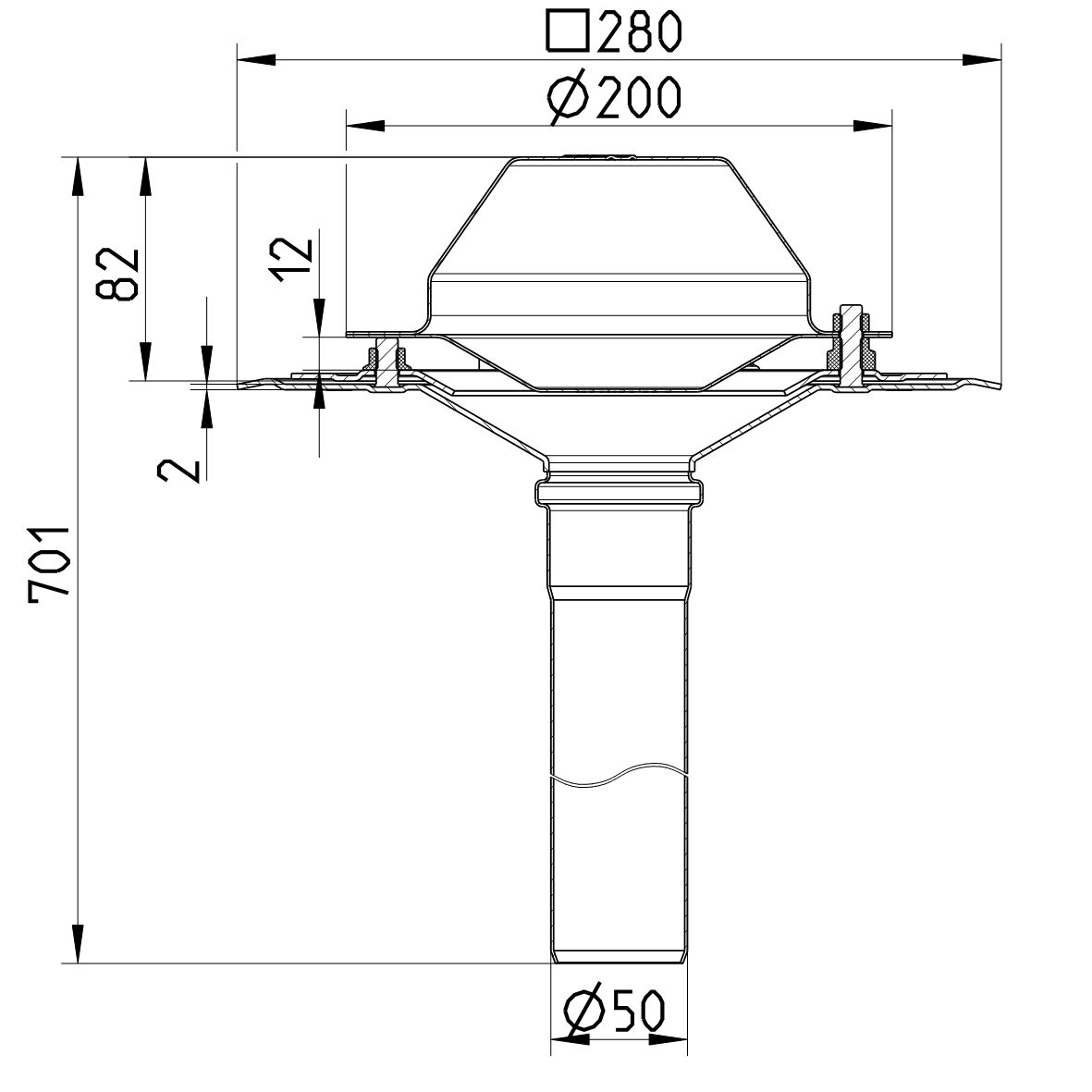 Wpust dachowy podciśnieniowy DN =50 mm z kołnierzem nierdzewnym do pojedynczej warstwy izolacyjnej, długość wpustu 702 mm