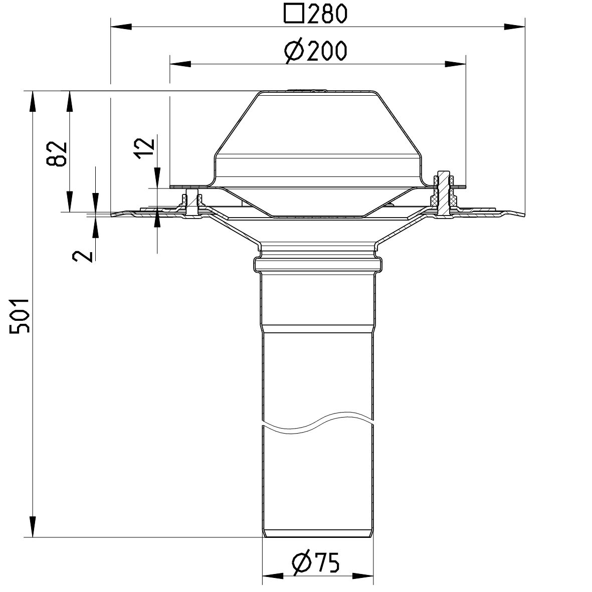 Wpust dachowy podciśnieniowy DN =75 mm z kołnierzem nierdzewnym do pojedynczej warstwy izolacyjnej, długość wpustu 502 mm