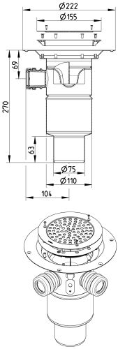 Wpust łazienkowy odpływ pion DN =75 mm, ruszt okrągły, 2 dopływy, do podłóg winylowych, stal kwasoodporna