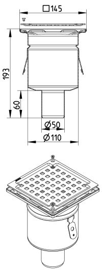 Wpust łazienkowy, ruszt kwadratowy, odpływ pion DN =50 mm, stal kwasoodporna