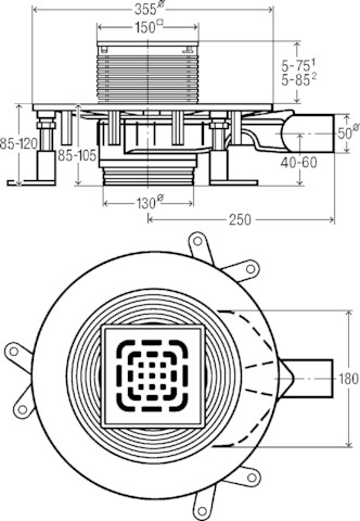Wpust VIEGA 491421 z 1 przyłączem DN 50, odpływ pionowy, kratka 150x150mm stal