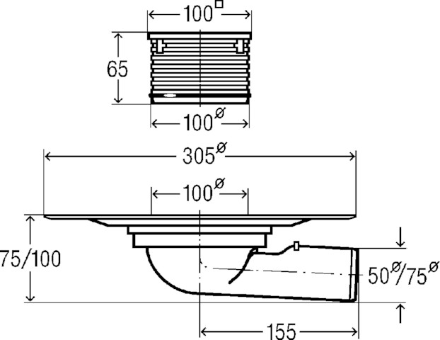 Advantix-odpływ balkonowy/tarasowy, wymiar systemowy 100, nie występuje: syfon. Wyposażenie: Kołnierz uszczelniający, obracana nasadka 100×100 mm z regulacją wysokości, korek, ramka z tworzywa sztucznego, ruszt ze stali nierdzewnej 1.4301. Dane techniczne: klasa obciążenia K=300 kg, wg PN-EN 1253, nr wzoru 4943.2, nr kat. 557 089, DN: 70 wydajność odpływu przy wysokości spiętrzenia 35 mm (wg PN-EN 1253): 3 l/s, odpływ poziomy,