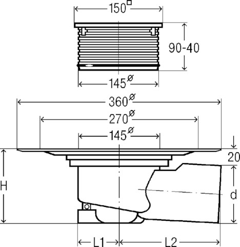 Advantix-odpływ podłogowy, wymiar systemowy 145. Wyposażenie: Kołnierz uszczelniający, obracana nasadka 150×150 mm z regulacją wysokości, korek, ramka z tworzywa sztucznego, ruszt ze stali nierdzewnej 1.4301, syfon wyjmowalny. Dane techniczne: klasa obciążenia K=300 kg, wg PN-EN 1253, nr wzoru 4955.1, nr kat. 557 171, DN: 100 wydajność odpływu przy wysokości spiętrzenia 10 mm: 1.2 l/s, wydajność odpływu przy wysokości spiętrzenia 20 mm: 1.7 l/s, odpływ poziomy,