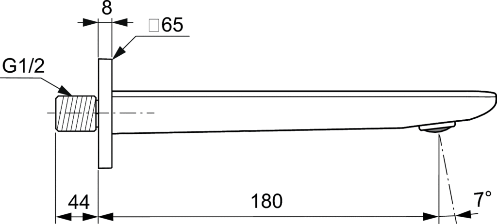 Wylewka długości 180 mm. Metalowa chromowana rozeta 65x65 mm z logo Ideal Standard. Aerator M24x1. Podłączenie G1/3.