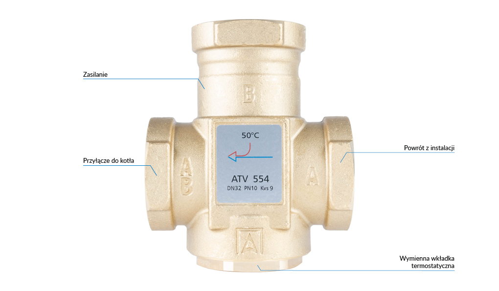 W instalacjach z kotłami stałopalnymi miesza lub rozdziela strumień medium. W przypadku funkcji mieszania ATV zabezpiecza kocioł przed korozją niskotemperaturową na skutek powrotu wody o zbyt niskiej temperaturze. W przypadku funkcji rozdzielania ATV rozdziela medium między powrotem do kotła a zasilaniem instalacji, umożliwiając wygrzanie kotła do odpowiedniej temperatury.