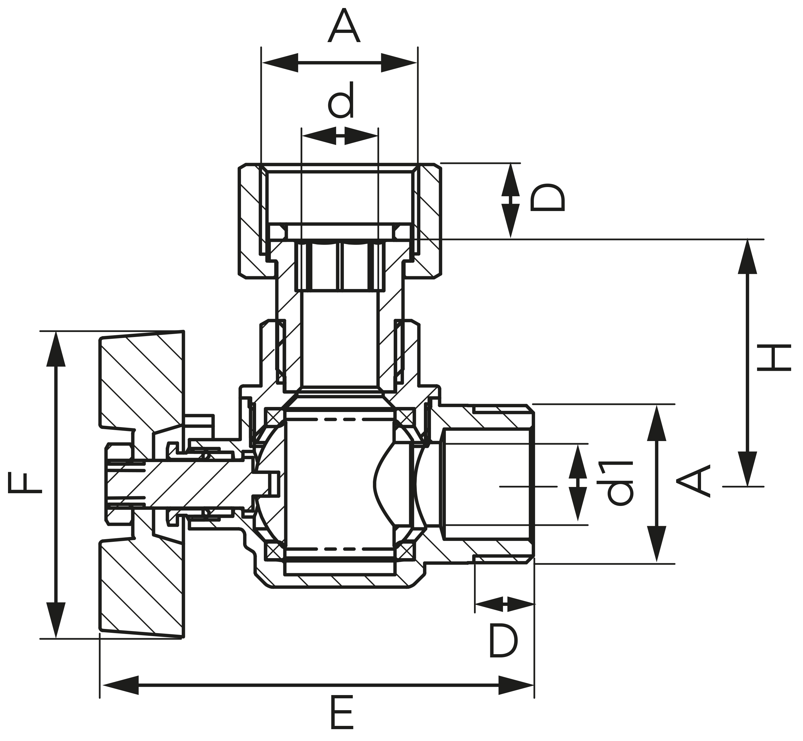 Zawór kątowy z obrotową nakrętką. Uszczelnienie płaskie, uszczelka EPDM. Konstrukcja zaworu umożliwia prosty montaż i demontaż urządzeń. Zawór wykonany jest z wysokogatunkowego mosiądzu CW617N - 4MS. Zastosowanie w instalacjach, gdzie medium to woda lub woda/glikol.