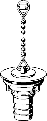 Zawór odpływowy. Przeznaczenie: mały zlewozmywak. Wyposażenie: Przyłącze pionowe do węża odprowadzającego wodę odpływową, korek do zaworu, łańcuszek kulkowy chromowany (250 mm) z wspornikiem z łańcuszkiem, nr wzoru 7372, nr kat. 105 624, G: ¾ Ø: 50