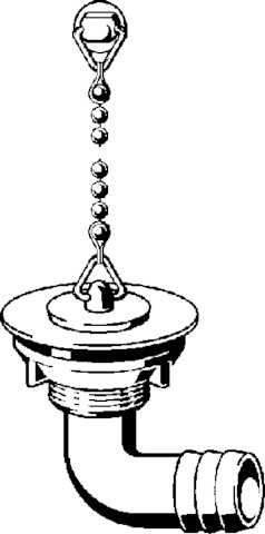 Zawór odpływowy. Przeznaczenie: mały zlewozmywak. Wyposażenie: Przyłącze poziome do węża odprowadzającego wodę odpływową, korek do zaworu, łańcuszek kulkowy chromowany (250 mm) z wspornikiem z łańcuszkiem, nr wzoru 7373.1, nr kat. 125 523, G: ¾ Ø: 50