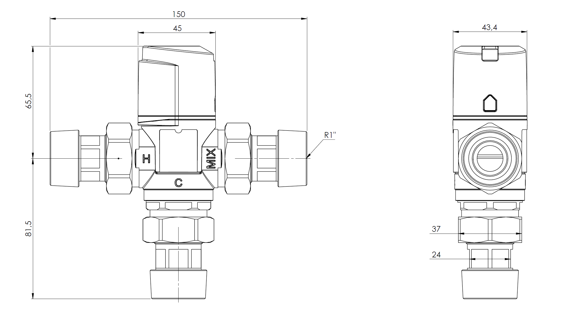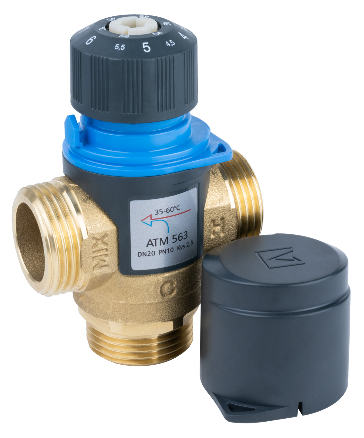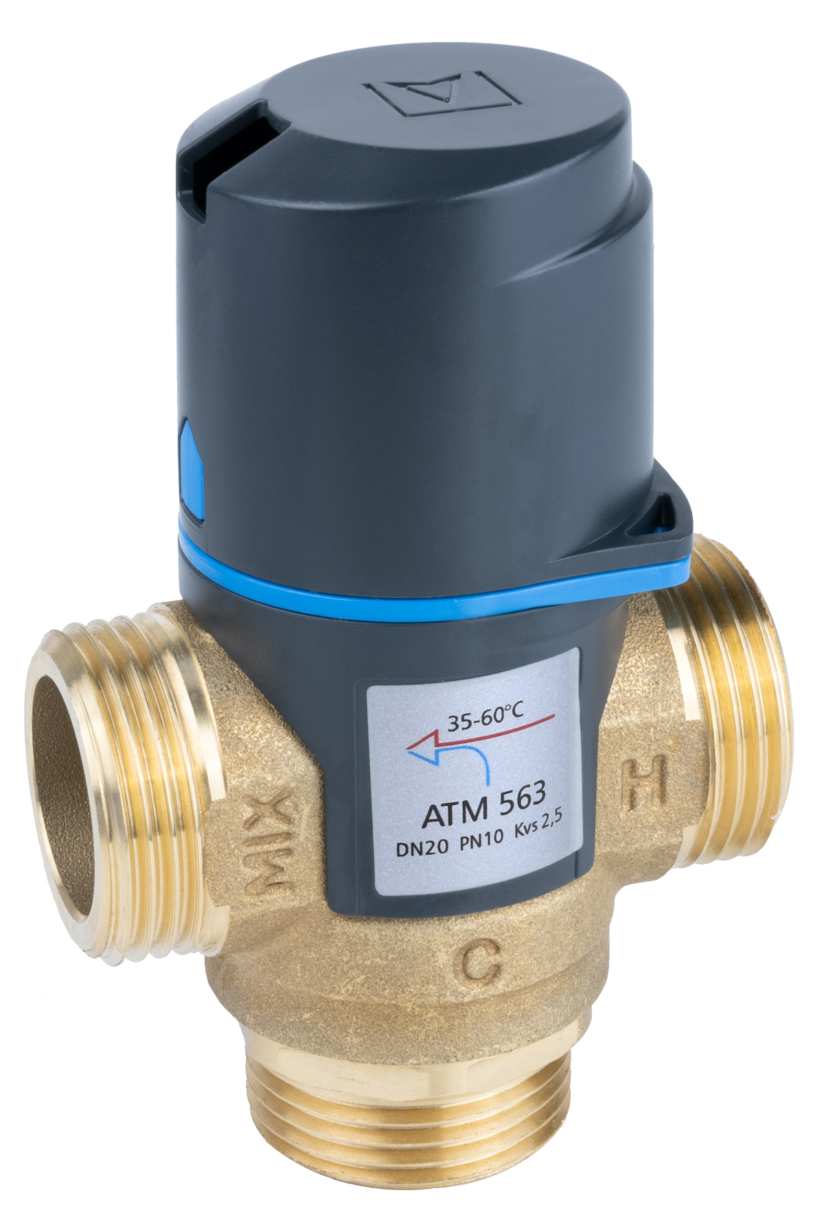 Zawór regulacyjny termostatyczny do wody ciepłej AFRISO ATM 563 ze śrubunkami mosiądz GZ 1'', DN 20, zakres temp. 35-60'C, Kvs 2.5 m3/h, maksymalna temperatura 90'C, maksymane ciśnienie 10 bar