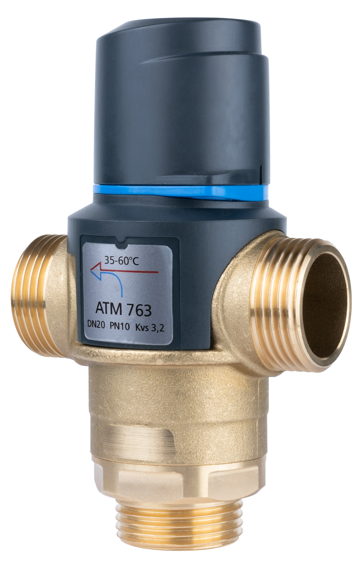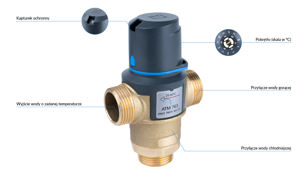 Zawór regulacyjny termostatyczny do wody ciepłej AFRISO ATM 763 mosiądz GZ 1'', DN 20, zakres temp. 35-60'C, Kvs 3.2 m3/h, maksymalna temperatura 110'C, maksymane ciśnienie 10 bar