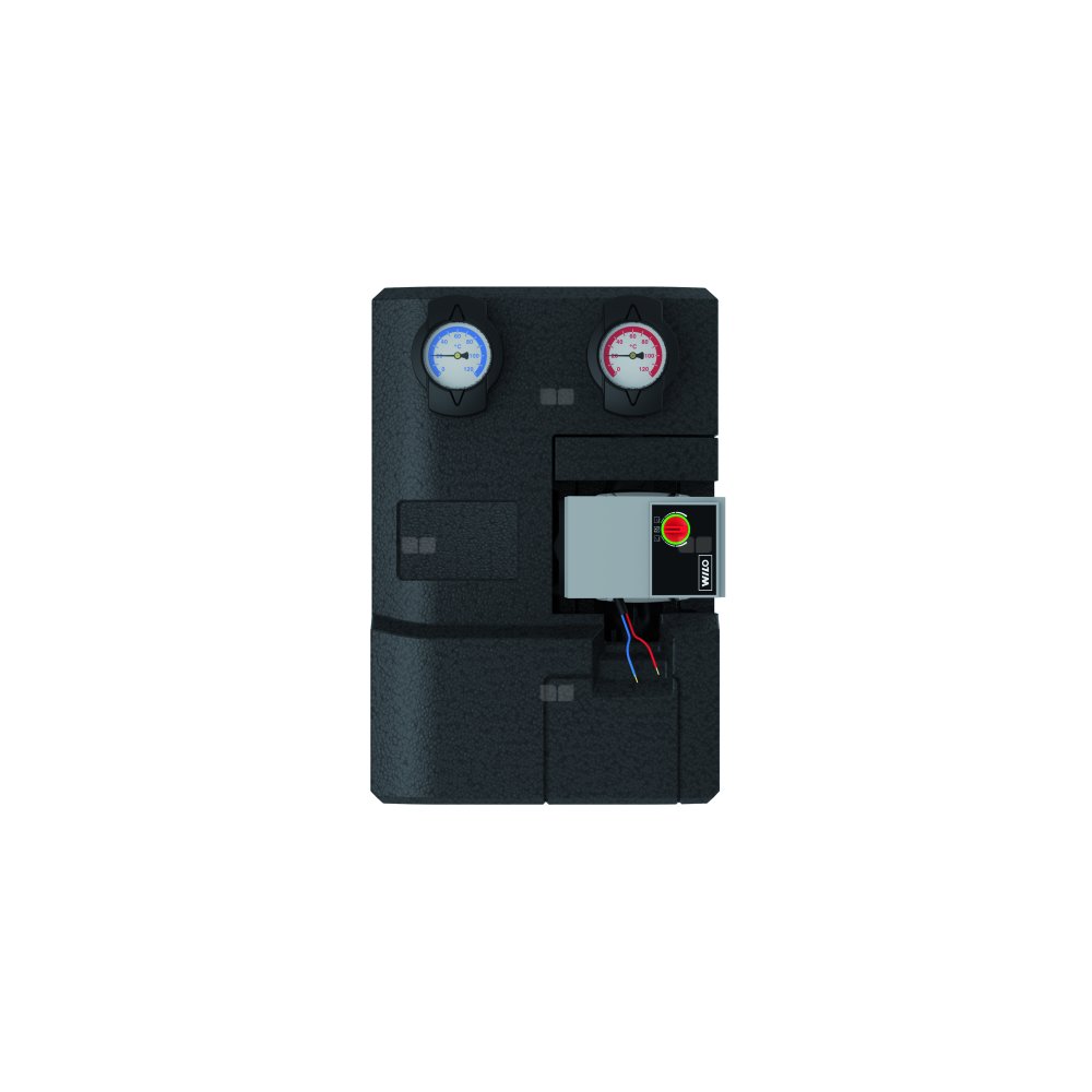 Moduł hydrauliczny całkowicie zmontowany, w izolacji. Wyposażony w pompę Wilo Yonos Para RS 25/6, dwa termometry zintegrowane z zaworami odcinającymi, zawór zwrotny klapowy.