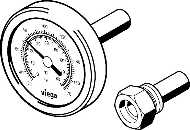 Zestaw termometrów. Przeznaczenie: ogrzewanie powierzchniowe Fonterra, montaż w belce zasilającej lub powrotnej. Zastosowanie: rozdzielacz obwodów grzejnych DN25 nr wzoru 1004, 1010, wskaźnik 0–80°C ewent. 32–176°F. Wyposażenie: Termometr, tuleja zanurzeniowa, nr wzoru 1010.9, nr kat. 789 626, G: ⅜ Ø: 50 głębokość zanurzenia: 24 mm,