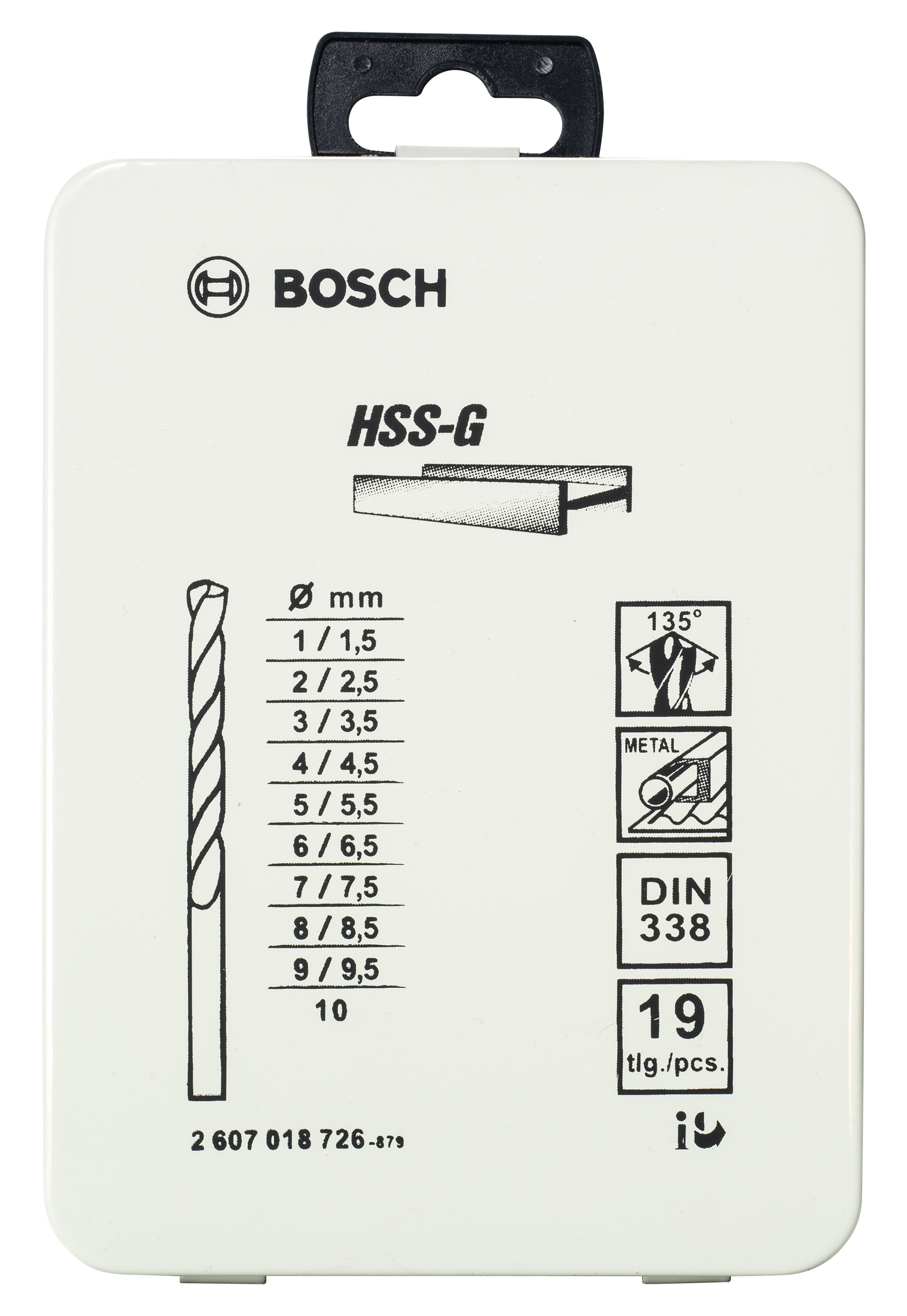 Opis zestawu 19-elem. zestaw wierteł do metalu HSS-G, DIN 338, 135° w metalowej kasecie Średnice (mm): 1; 1,5; 2; 2,5; 3; 3,5; 4; 4,5; 5; 5,5; 6; 6,5; 7; 7,5; 8; 8,5; 9; 9,5; 10 Długości robocze (mm): 12; 18; 24; 30; 33; 39; 43; 47; 52; 57; 57; 63; 69; 69; 75; 75; 81; 81; 87