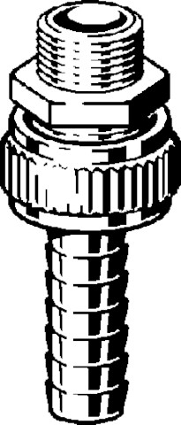 Złączka do rury stojakowej, mosiądz, gwint R, uszczelnienie stożkowe. Wyposażenie: Radełkowana nakrętka złączkowa, nr wzoru 1832, nr kat. 122 416, R: ⅜ do średnicy wewnętrznej węża: ⅜ gwint nakrętki G: ½