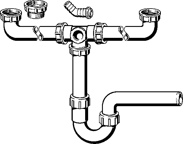 Złącze odpływowe. Przeznaczenie: zlewozmywak podwójny, tworzywo sztuczne. Wyposażenie: Odpływ osiowy, przyłącze do węża odprowadzającego wodę odpływową, element do wyrównania wysokości, syfon rurowy, nr wzoru 7928.5, nr kat. 119 744,