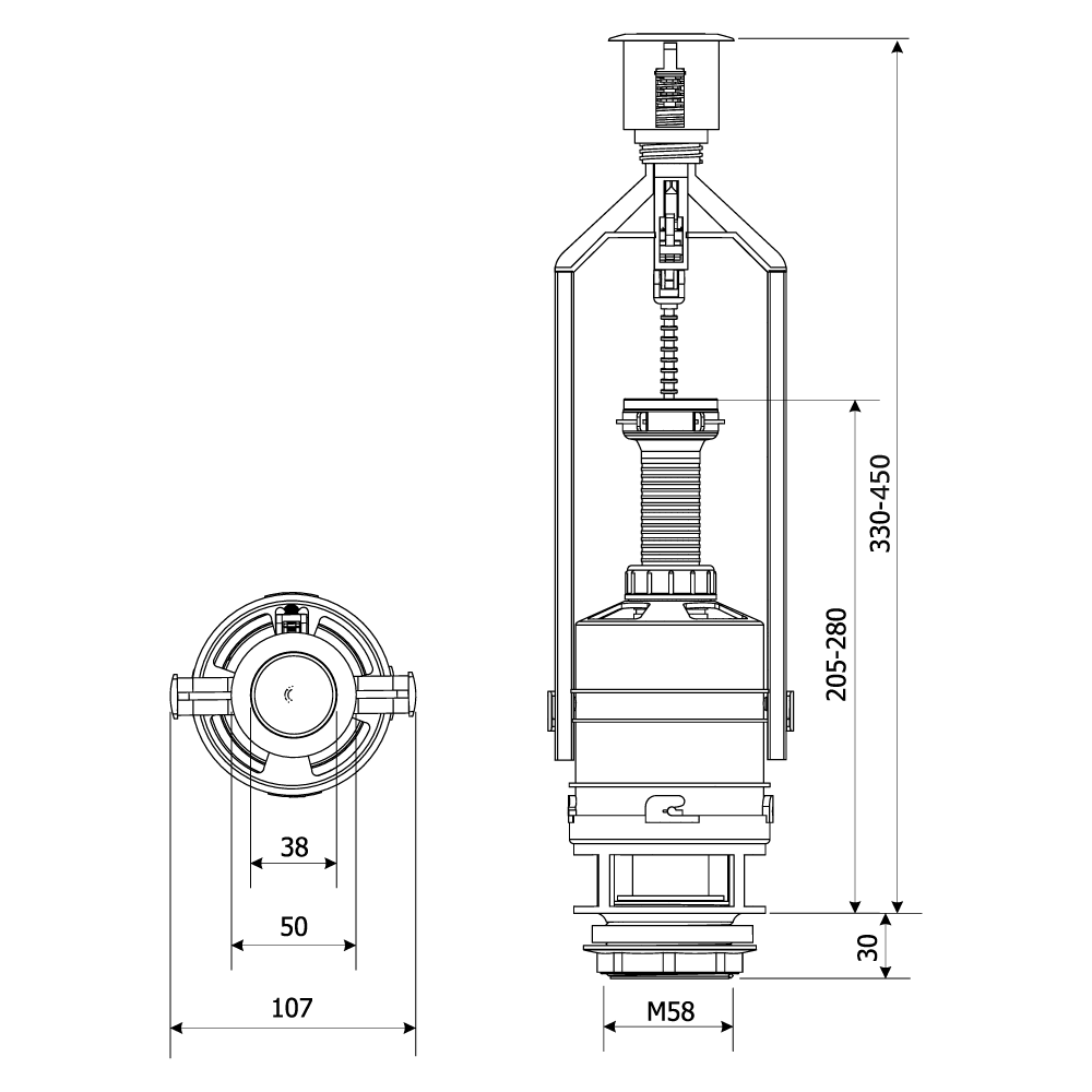 Zawór spustowy z funkcją STOP KOMPAKT BIS przeznaczony jest do kompaktów WC o wysokości od 330 do 450 mm i minimalnym poziomie napełnienia 130 mm. Dysponuje dwoma opcjami - spust wody / zatrzymanie. Cechuje go duży zakres nastawiania wysokości.Dane techniczne